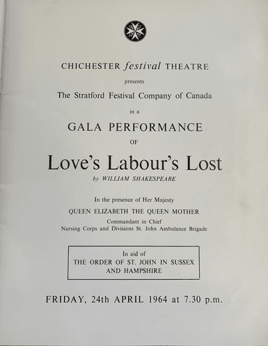 Two years later in 1964, Stratford Festival Players embarked on a $100,000 tour to Chichester with three productions: Timon of Athens, Le Bourgeois Gentilhomme and Love's Labour's Lost, the latter attended by the Queen Mother for a gala performance on 25 April. The success of the tour made international news, coinciding with Shakespeare's 400th birthday. Cast member William Hutt noted "Thank god [...] the English critics have judged us on our merits and never been patronising." Canadian Prime Minister wrote "Canada is proud of your contribution to the 400th anniversary celebrations of Shakespeare's birth."