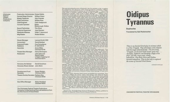 Individual production programmes were not introduced consistently until 1995. The cast list spells the title of the play incorrectly as 'Oidipus' not 'Oedipus'.