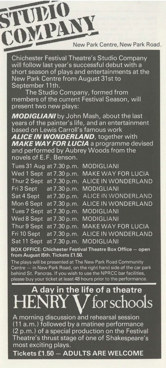 Many productions, including one-act plays and rehearsed readings were staged at venues in and around Chichester including the old ballroom at The Dolphin & Anchor Hotel (now the upper floor of Waterstones). One of the most memorable productions was T.S. Eliot's Murder in the Cathedral (1977), a visually striking production held in the nave of the Cathedral with Michell starring as Becket. This fringe project was renamed "Chichester Festival Theatre Studio Company" in 1981 and ultimately led to the creation of The Tent in 1983 and the Minerva Studio Theatre in 1989.
