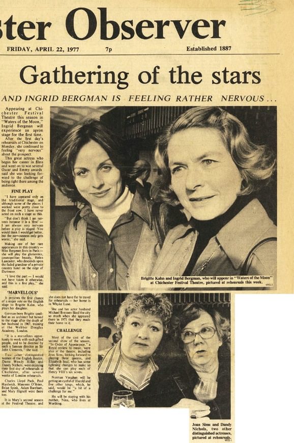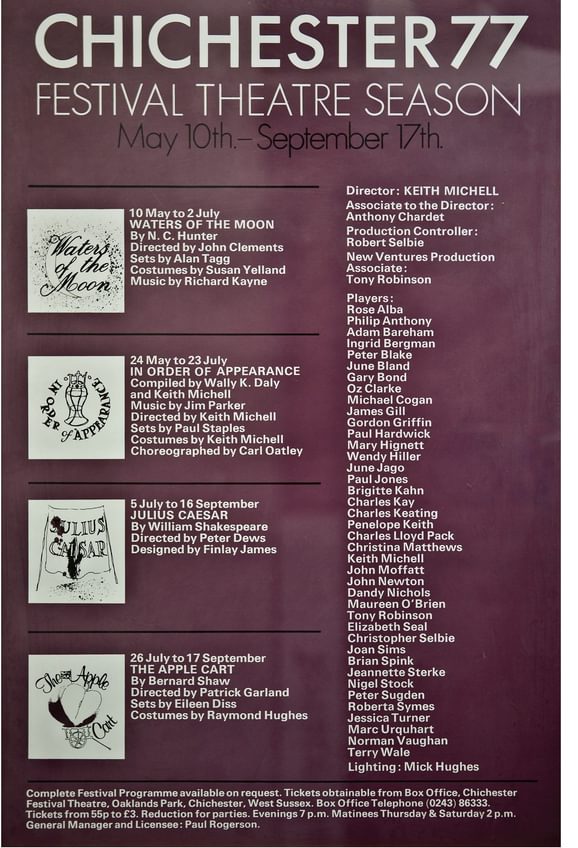 The 1977 production of The Apple Cart stands out as a high point in the Theatre’s history. It starred Penelope Keith, who was widely recognised as Margo in the BBC sitcom The Good Life. Famously she met her future husband, a policeman, backstage during the royal gala performance of this production. During Artistic Director Keith Michell's four year tenure, many household names trod the CFT boards including Hollywood star Ingrid Bergman, Patricia Routledge, Barbara Windsor, Donald Sinden and Rex Harrison. Explore the 1977 season below, and beyond...