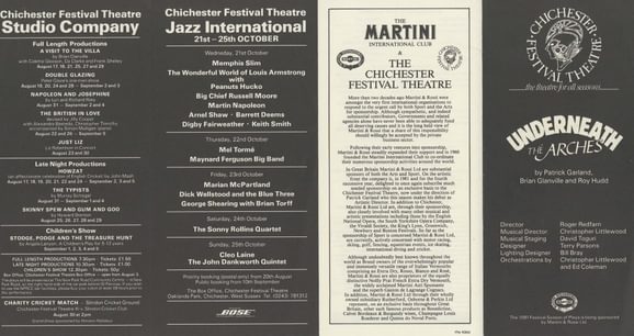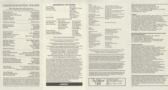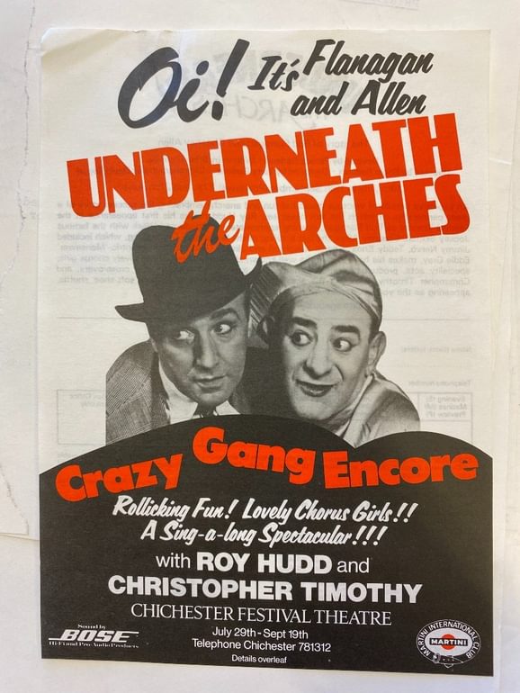 The 1981 season is fondly remembered at CFT for the musical revue Underneath the Arches, the story of two of Britain's most popular entertainers: the wicked Bud Flanagan, and the urbane Chesney Allen, and their association with a bunch of knockabout comedians known as "The Crazy Gang".
