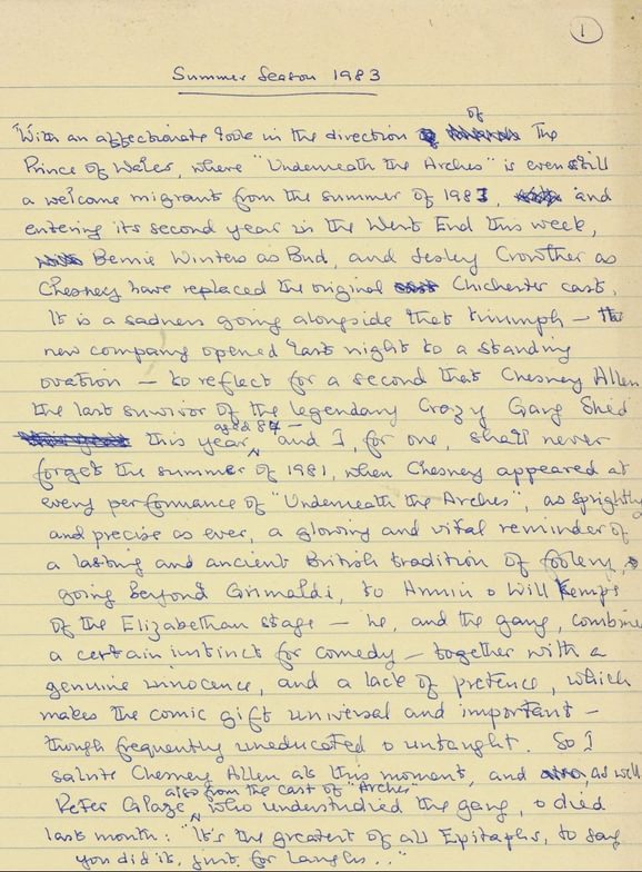 It is a sadness going alongside that triumph – the new company opened last night to a standing ovation – to reflect for a second that Chesney Allen the last survivor of the legendary Crazy Gang died this year, aged 87, and I, for one, shall never forget the summer of 1981, when Chesney appeared to every performance of 'Underneath the Arches', as slightly and precise as ever, a glowing and vital reminder of a lasting an ancient tradition of foolery, going beyond Grimaldi, to Armin, to Will Kemps of the Elizabethan stage – he, and the hand, combine a certain instinct for comedy – together with a genuine innocence, and a lack of pretence, which makes the comic gift universal and important – though frequently uneducated and untaught. So I salute Chesney Allen at this moment, and as well Peter Glaze also from the cast of “Arches” who understudied the gang and died last month. “It is the greatest of all Epitaphs, to say you did it, just for laughs..”
