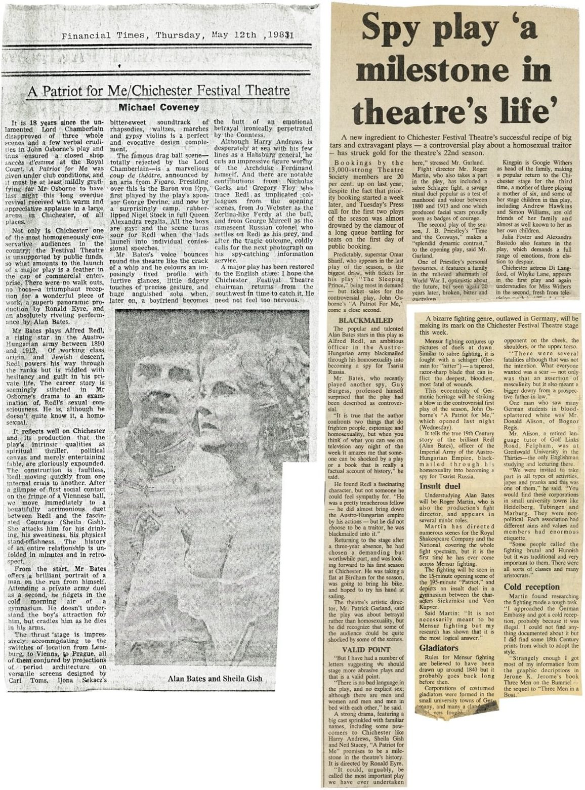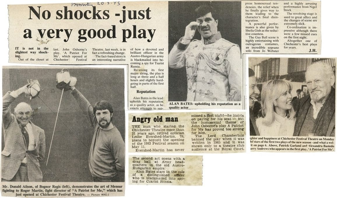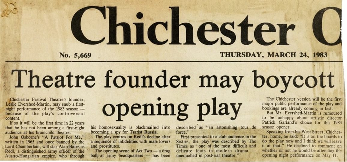 Starring Alan Bates, it was based on a true story of homosexuality and blackmail in the years prior to The Great War, featuring a Drag Ball scene. It had infamously been refused a public licence when it was first staged at the Royal Court in 1965 and had not been performed since. Press coverage noted the apparently surprising inclusion in CFT's billing: "a whiff of scandal is drifting through the prim cathedral city of Chichester. After years of living in the deep, safe recesses of the past dressing itself up in annual star-invested revivals of old favourites, Chichester Festival Theatre is about to meet up with the theatrical present" (Guardian).