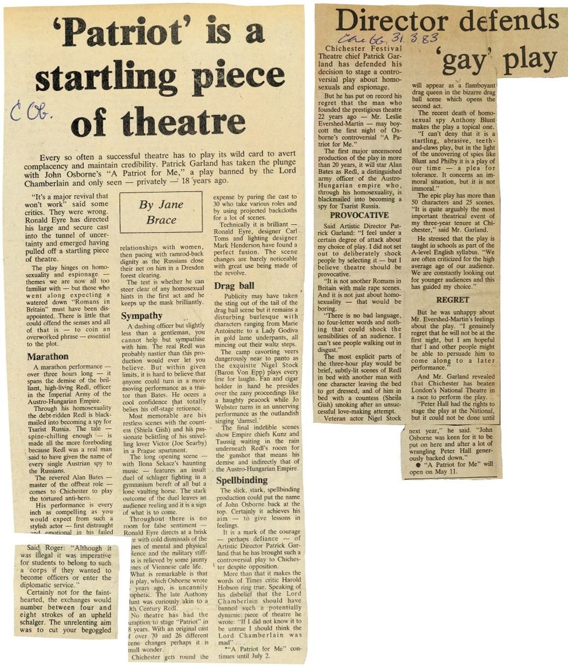 Eyebrows were raised when the 1983 season was announced, due to the opening production: John Osborne's A Patriot for Me.