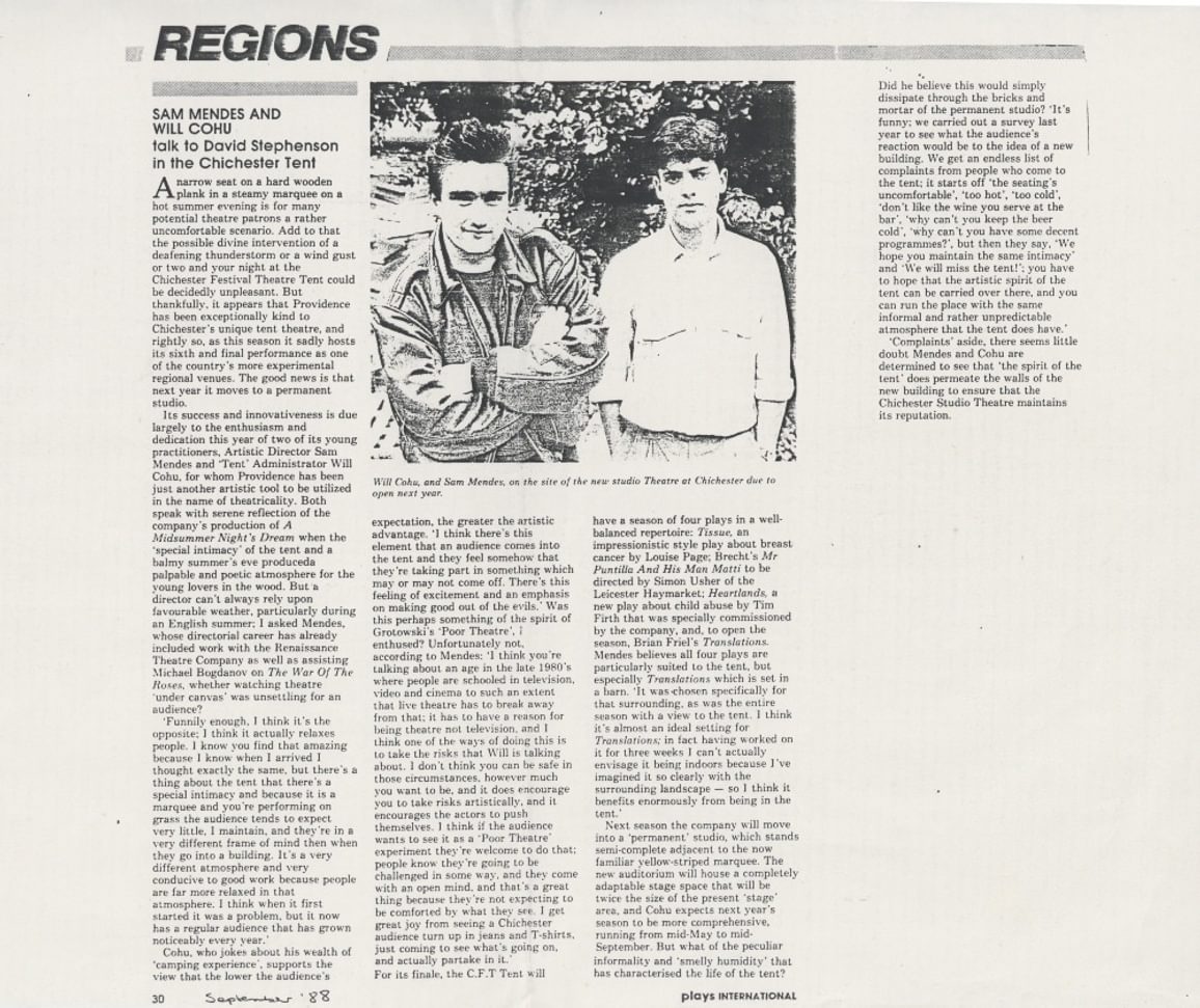 The Tent had 140 unreserved seats for experimental performances of drama, dance, music, comedy and other events, including Chopped Hamlet (1984), The Spershott Version (1986) and Brian Friel's Translations (1988). It ran alongside main Festival Theatre season, with the intention of attracting younger audiences and offering starring roles to young or ensemble actors from the Main House. Its opening season was such a success that The Tent was re-erected each Spring and taken down every Autumn from 1984-88, eventually leading to the construction of the Minerva Theatre in 1989. Academy Award-winning director Sam Mendes worked as assistant director at The Tent at the start of his career in 1987. After he'd successfully directed a late night double-bill, John Gale took a leap of faith and offered him the job of running The Tent in 1988. The following year, Mendes became the first Artistic Director of the new Minerva Theatre.
