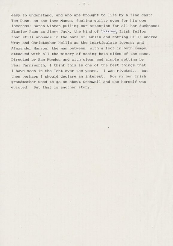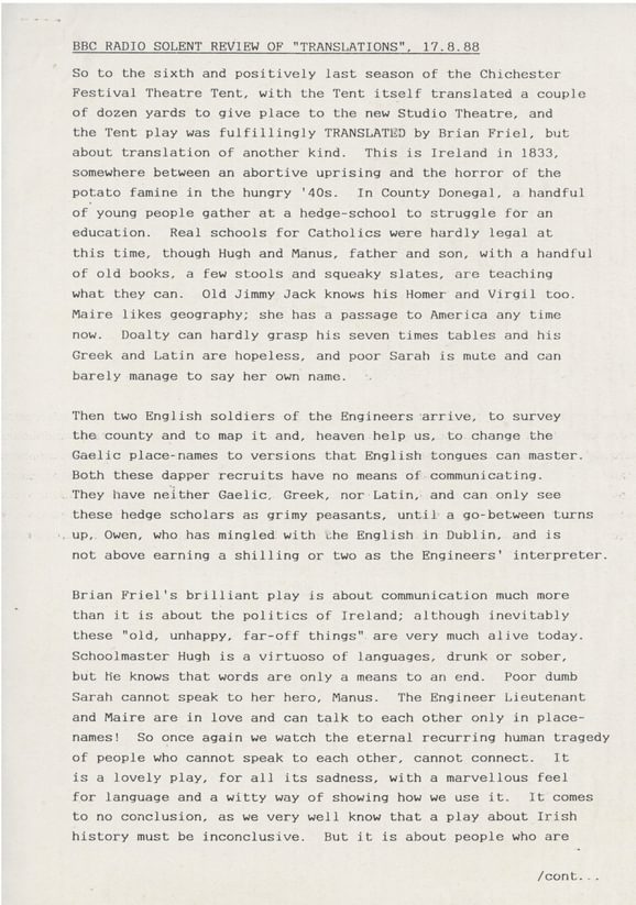 BBC Radio Solent review of Brian Friel's Translations, 1988 in The Tent