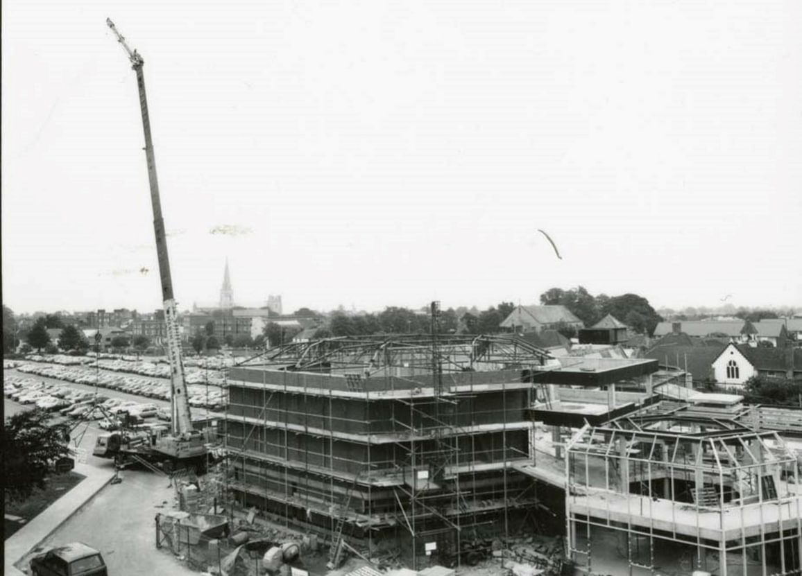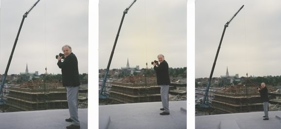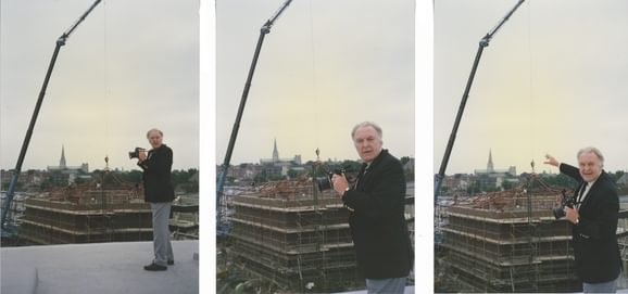 Actor Donald Sinden captures photograph of construction of the Minerva from the roof of the Festival Theatre