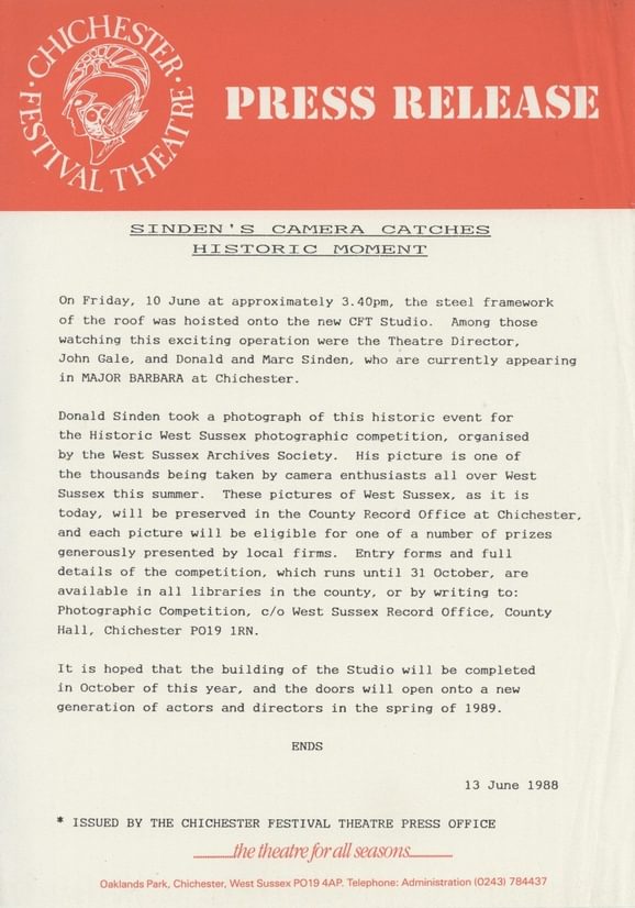 1989 was a very significant year in the history of Chichester Festival Theatre. Following the success of The Tent, a permanent home was built to house future studio performances: the Minerva Theatre.