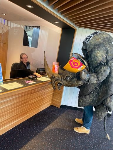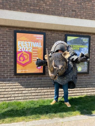 A co-production with the Peter Hall Company, the set and costumes were particularly impressive. Audiences fondly remember Mandy Patinkin soaring above their heads on a zipwire across the auditorium, a full-size glass lift and more than thirteen full size rhino costumes designed by Gerald Scarfe. Following the production, the costumes were donated to the charity Save The Rhino and have become an iconic emblem of the charity at marathons and fundraising events all over the world. One even made it to the top of Kilimanjaro in 1994, worn by the charity's founder patron Douglas Adams! In 2022, one rhino costume returned to CFT for the 60th anniversary year - view the photos below.