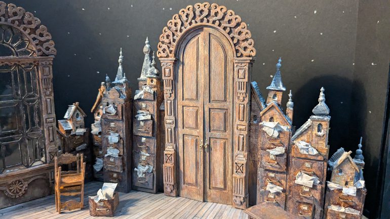 “Then I thought, OK, if that’s telling us this is a space for officialdom, how can I also tell the story of the town itself? Which is why, at the top of the filing cabinets, I’ve got this miniature world of houses and churches that evokes the community the mayor is in charge of. Hopefully that element will give us a sense of both indoors and outdoors, and theatrically elevate it beyond naturalism – although we can play naturalistically in the space.